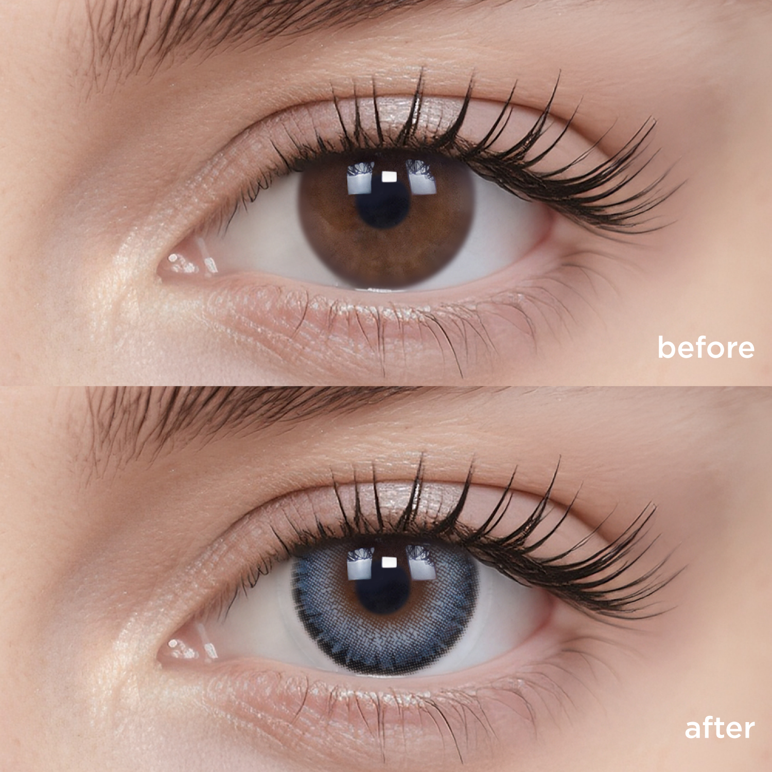The actual wearing effect might vary mainly due to the difference in original eye color and iris pattern. Other factors such as lighting, camera filter, eye shape, etc., might cause differences as well.