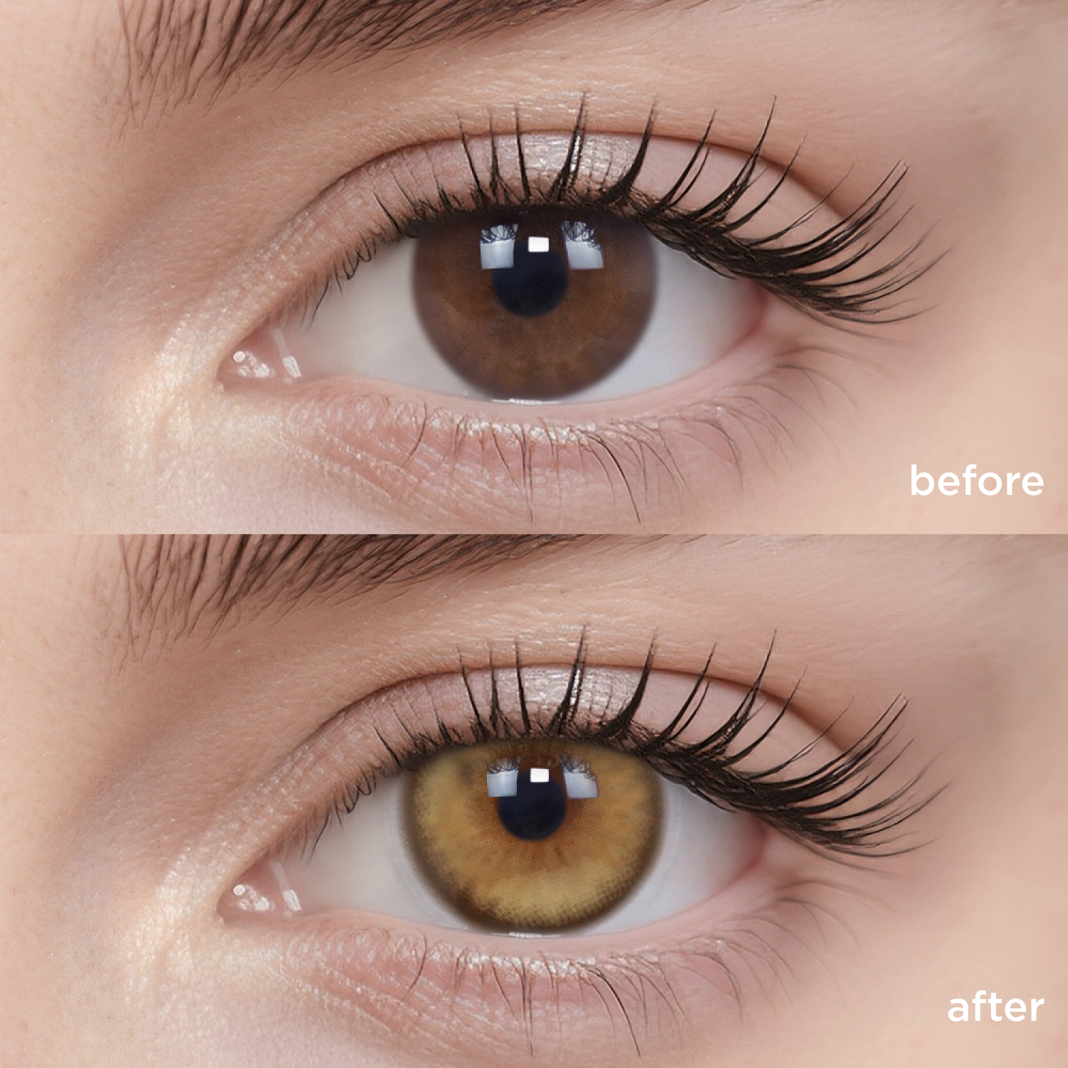 The actual wearing effect might vary mainly due to the difference in original eye color and iris pattern. Other factors such as lighting, camera filter, eye shape, etc., might cause differences as well.