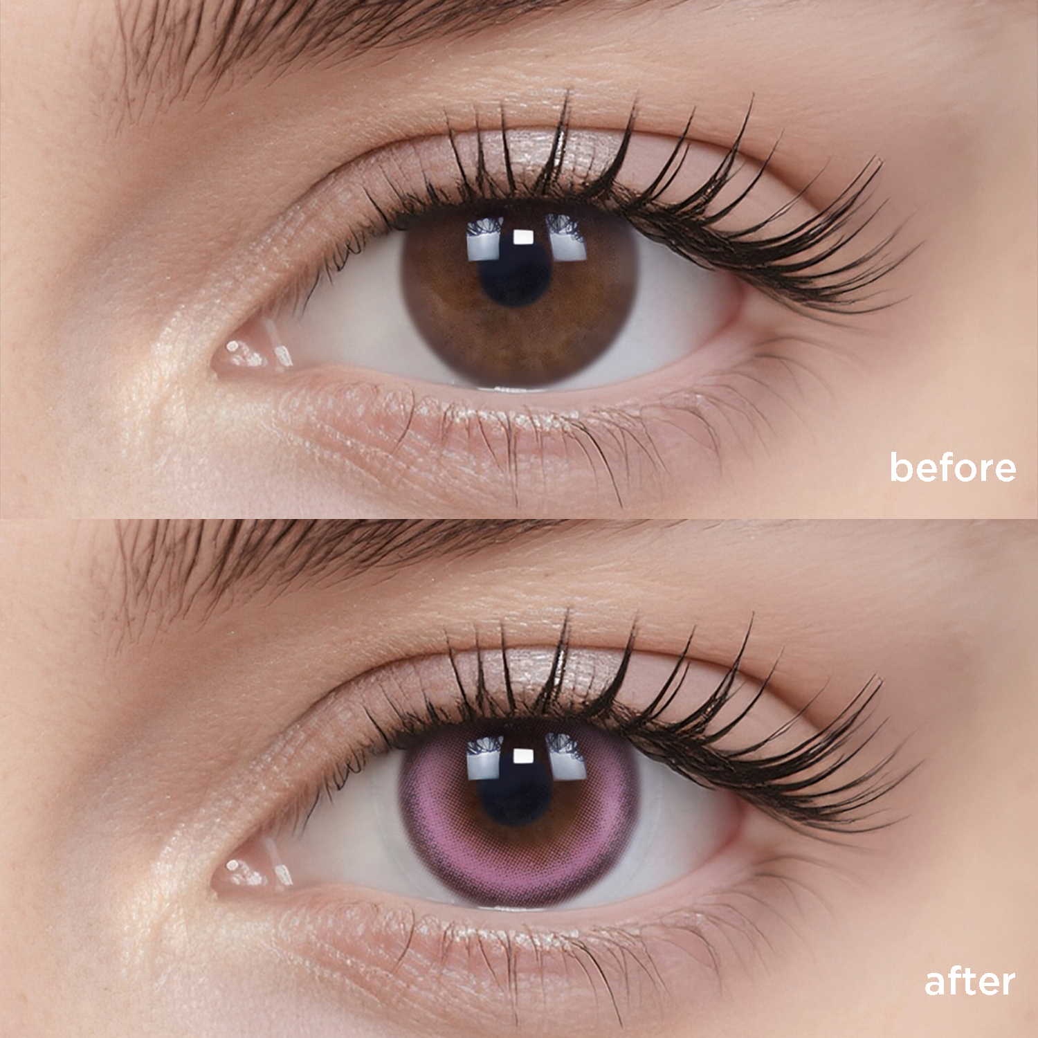 The actual wearing effect might vary mainly due to the difference in original eye color and iris pattern. Other factors such as lighting, camera filter, eye shape, etc., might cause differences as well.