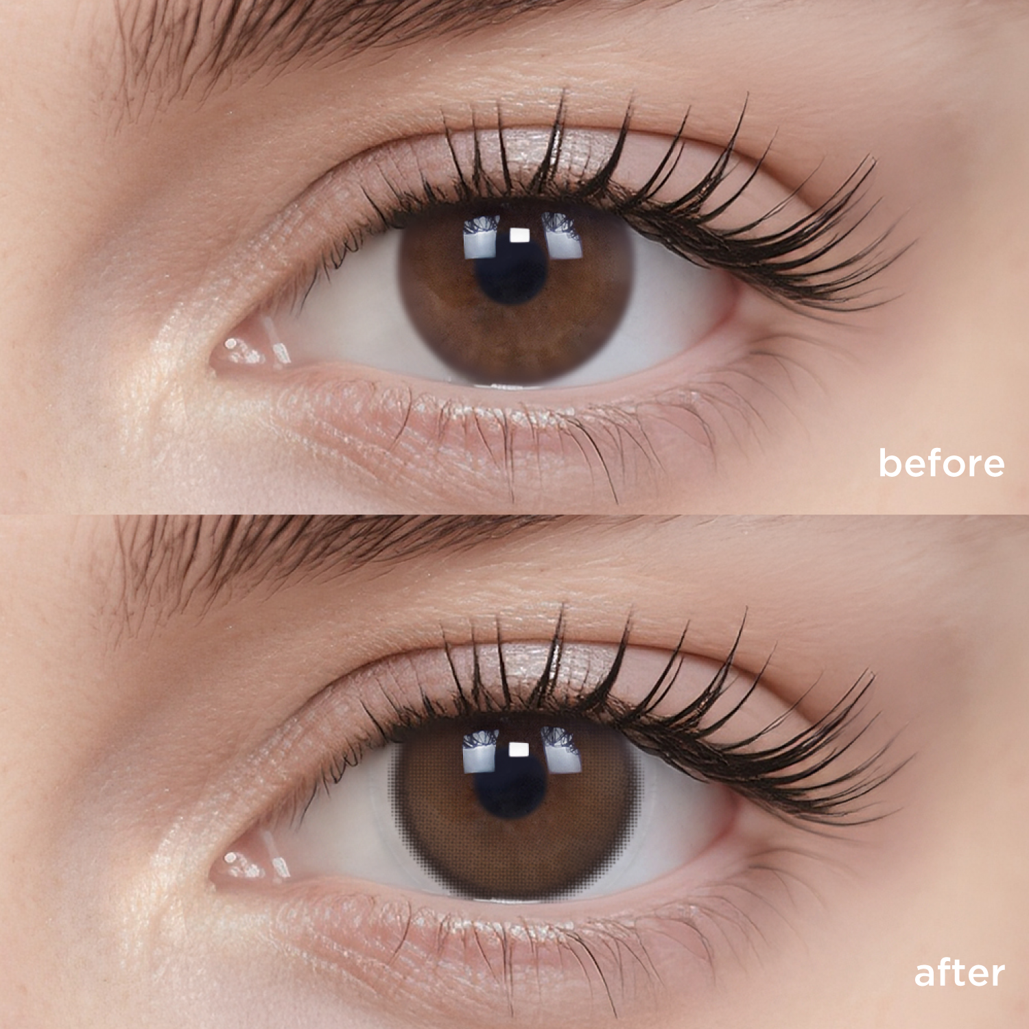 The actual wearing effect might vary mainly due to the difference in original eye color and iris pattern. Other factors such as lighting, camera filter, eye shape, etc., might cause differences as well.